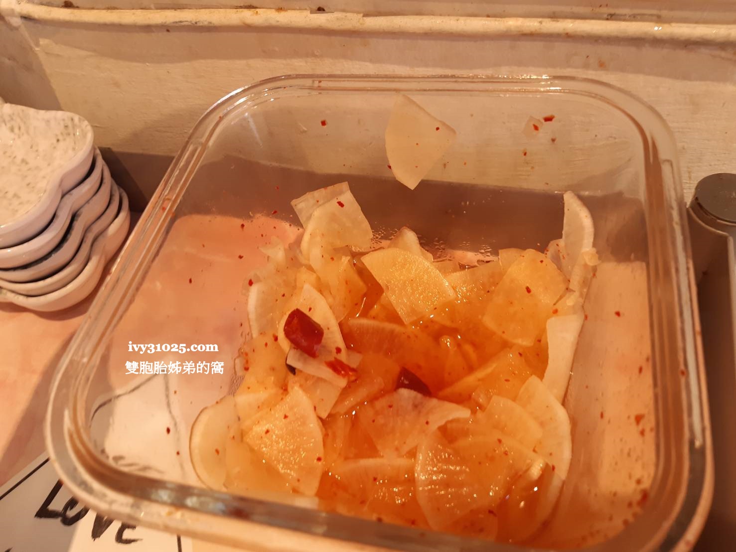 旁邊有韓國小菜 – 醃蘿蔔切片,甜甜地又帶點微辣的口感。