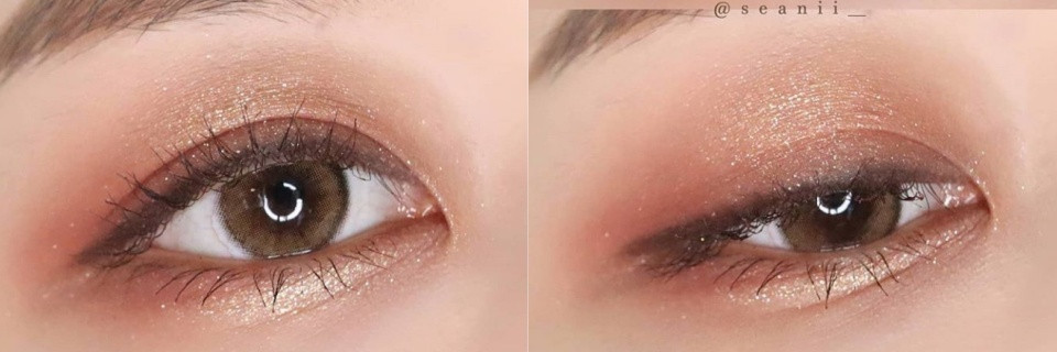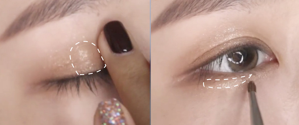 最後,用珠光色以指腹的方式,拍點在眼皮中央。範圍約與眼球同寬後,再自然暈開兩側交界處讓眼妝自然。如果想讓眼妝更精緻,可以用小眼線刷沾少量珠光色,勾勒下眼瞼後1/3處。這樣就完成漂亮又高級的眼妝囉!