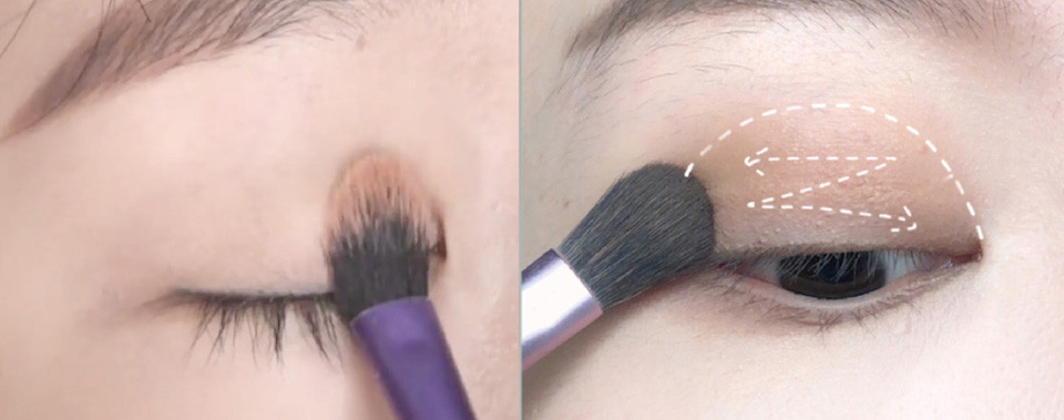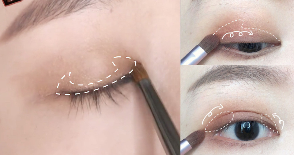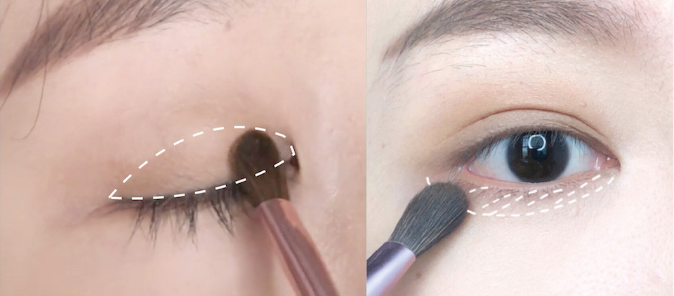 接著,用次深的咖啡色,在雙眼皮摺痕中稍作暈染(單眼皮可以抓上眼瞼約2-3mm處)。小技巧在於,不要整條線等粗的話過去做暈染,改用「眼頭粗、眼中細、眼尾粗」(下圖虛線示範)的眼影畫法,既能消腫泡眼還能透過眼妝幫眼睛自然放大唷!