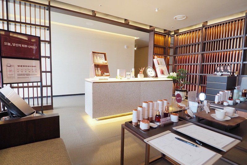 桌上有很多正官庄自家的保養品,都是可以使用的