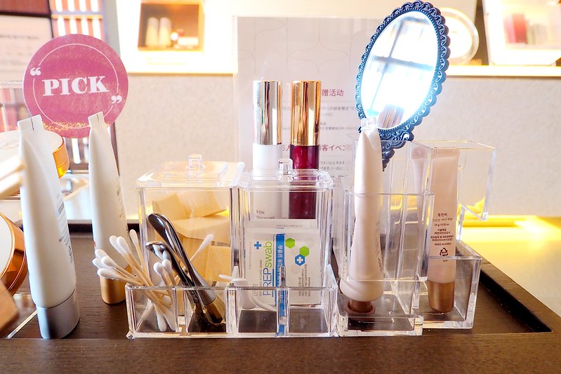 桌上有很多正官庄自家的保養品,都是可以使用的