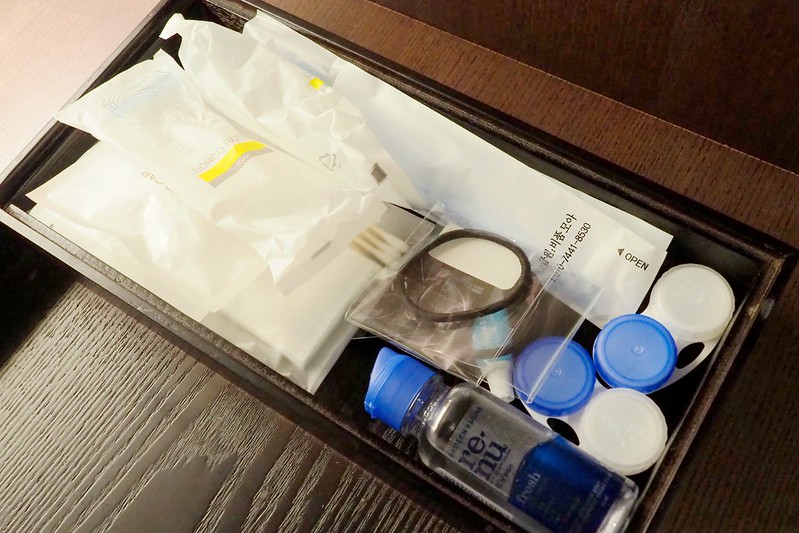 旁邊的小盒子打開還有牙刷.棉花棒.髮圈.甚至連隱形眼鏡盒.藥水全都幫你準備好超貼心
