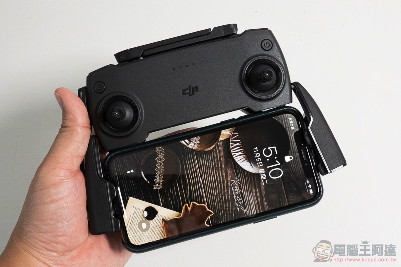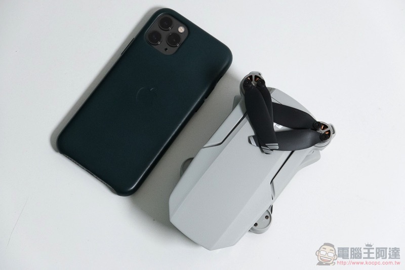 終於來到空拍機本體啦!直接與 iPhone 11 Pro 比較尺寸... 這還是小版本的手機呢,就已經差不多大小了,Mavic Mini 真的很輕巧: