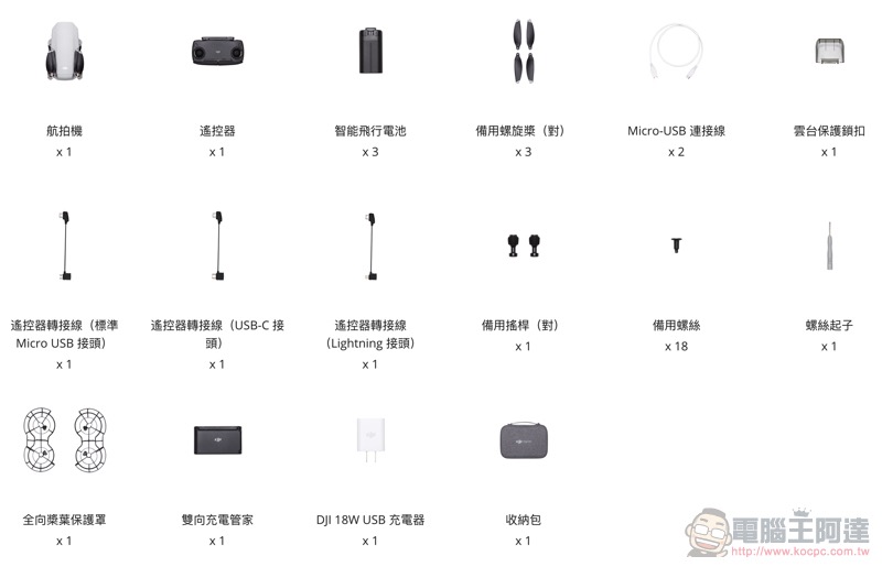 開箱的部分,其實 DJI 官網就做得很好,基本上攤平了所有入手的配件 -- 如下圖,右邊為單機版,儘管續航最長有 30 分鐘,不過會覺得單顆電池出門拍可能會不太過癮,所以推薦再多入手一顆電池。不過哩,以官方電池一顆 NT$1,450 的售價,再回頭看看那價差僅三千的「暢飛套餐」(左邊),感覺只塞兩顆鏡頭就幾乎抵銷那個價差了,所以應該大部分人應該都會選暢飛版本吧?因此,我們今天入手開箱的也就是這個版本。