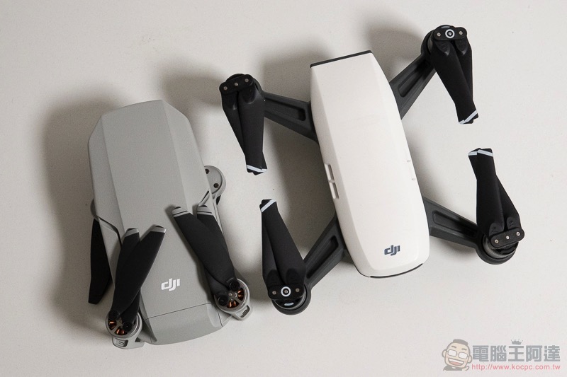 在聊飛行之前,小編也拿出自己官方續航時間只有 Mavic Mini 一半的 DJI Spark 來比較一下。其實展開的話,MM 還是比較大台(這也難怪明明 Mini 就比較輕,卻還是可以有跟 Spark 差不多數據了):