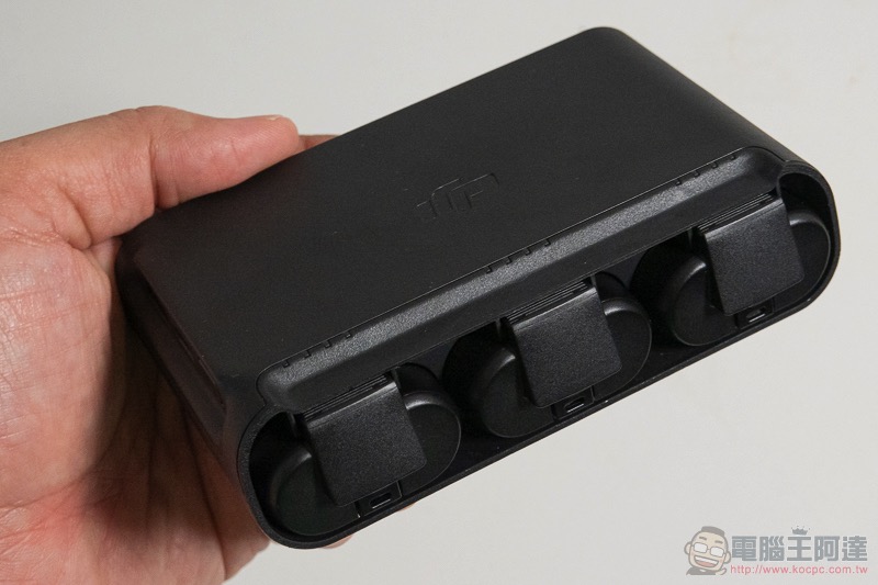 盒裝右上角的是 Mavic Mini 的電池管家,剛好可以插入三顆電池一次進行充電(會以電量較高的優先),有卡榫讓電池得以固定不亂跳動(跳開就不會充電了啊):