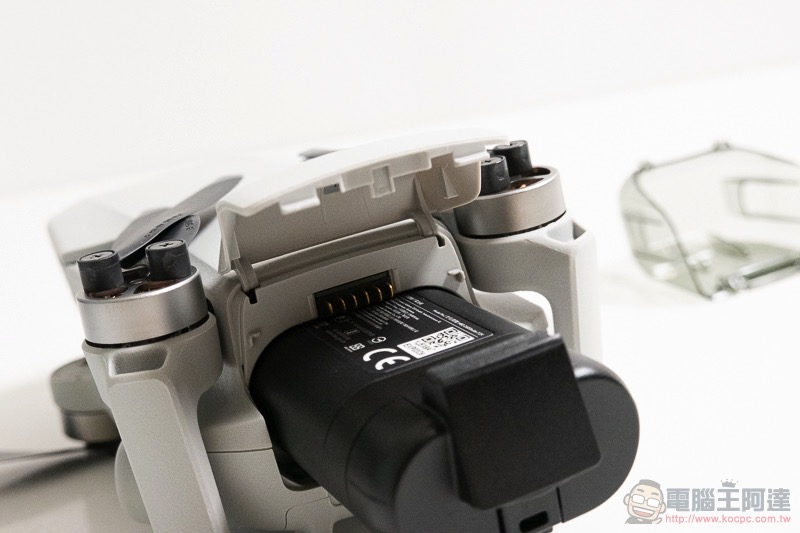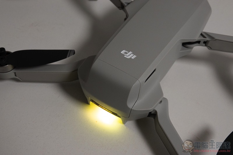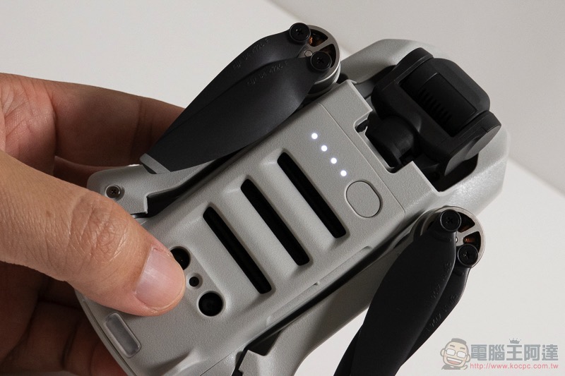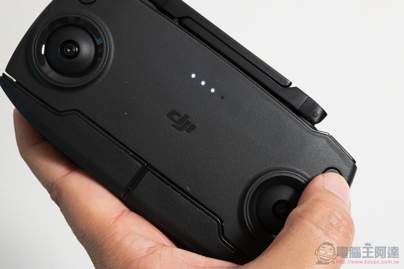 按壓電源按鈕可以確認電池目前的電量 -- 這次 Mavic Mini 的電池上並沒有提供顯示電量的燈號,所以要確認電量都需要靠連接的裝置進行,有點不夠直覺。不過如果因為拿掉燈號而讓電量變大到 30 分鐘,那麼我就覺得很可以(點頭):