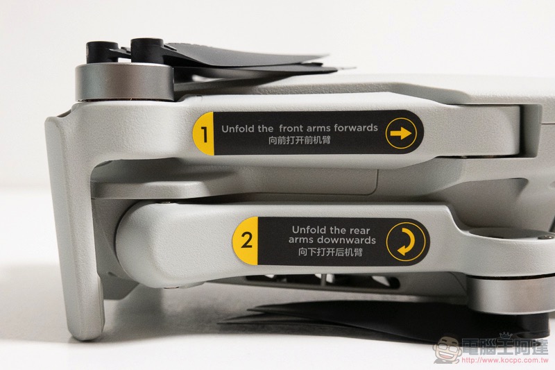 雖然感覺與地面支撐的前腳好像有點不太可靠(加上機身又輕),不過比起 Mavic Air 的折疊設計,感覺還是安心些: