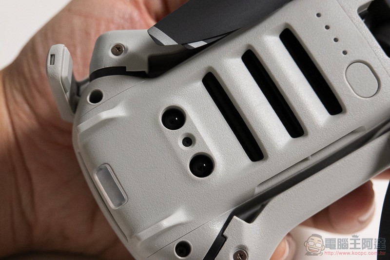 雖然感覺很像 Mavic Pro,正面好像有很多感測器一樣。不過 Mavic Mini 是不具備避障感測能力的(Spark 還會偵測正前方),不過底部還是有視覺(也就是用相機)的精準懸停功能: