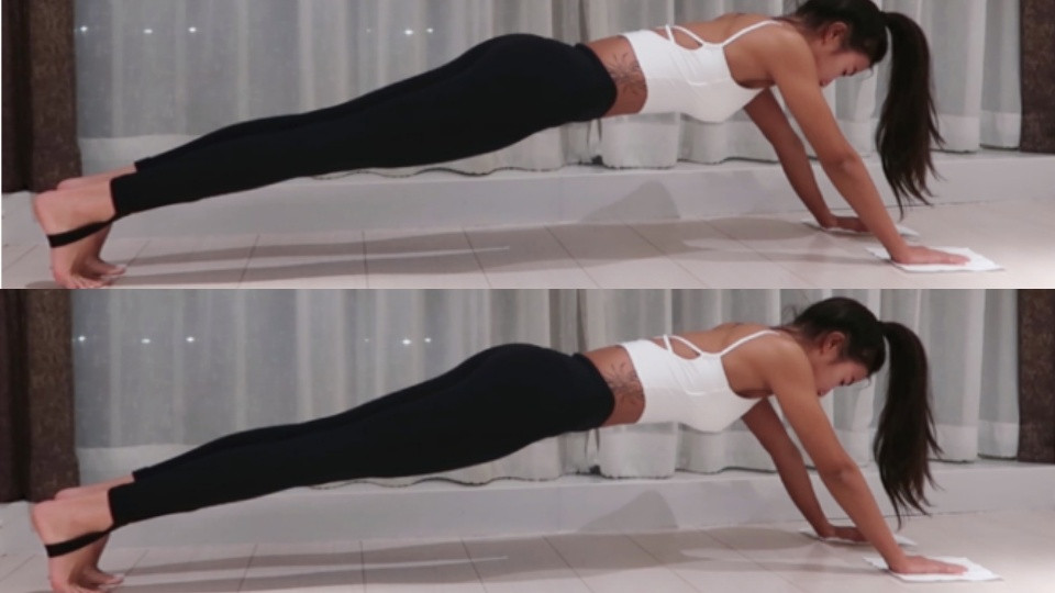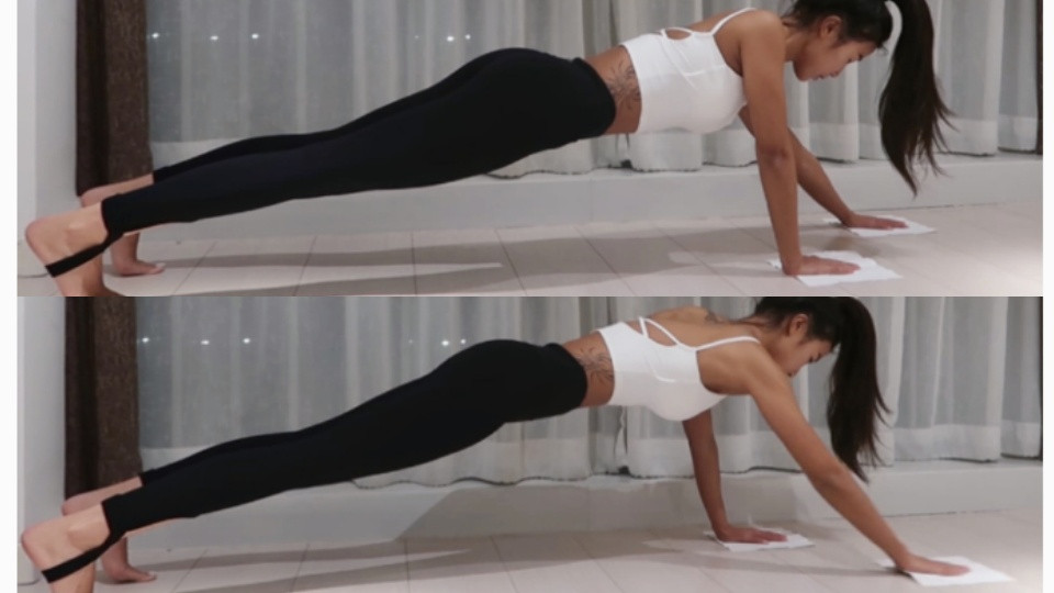 接著是棒式的變化款!一樣在雙手下墊兩張A4紙張,全身成棒式準備姿勢,接著雙手交互向前摩擦,做出類似擦地板的動作,不過要小心控制雙手的角度跟落點,不然很有可能會支撐不住身體~這一步可以已笑訓練肩關節的肌肉跟耐力,幫助消手臂贅肉!