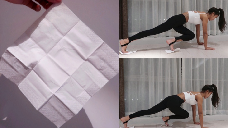首先就是虐腹、訓練核心最有效的棒式!不過比較不一樣的是,在雙手下方墊兩張A4紙張,做出棒式的姿勢後,雙手要一直往前滑行直到極限,並且維持30秒靜止不動,這樣可以讓腹部、腿部更緊繃,訓練核心的支撐力!