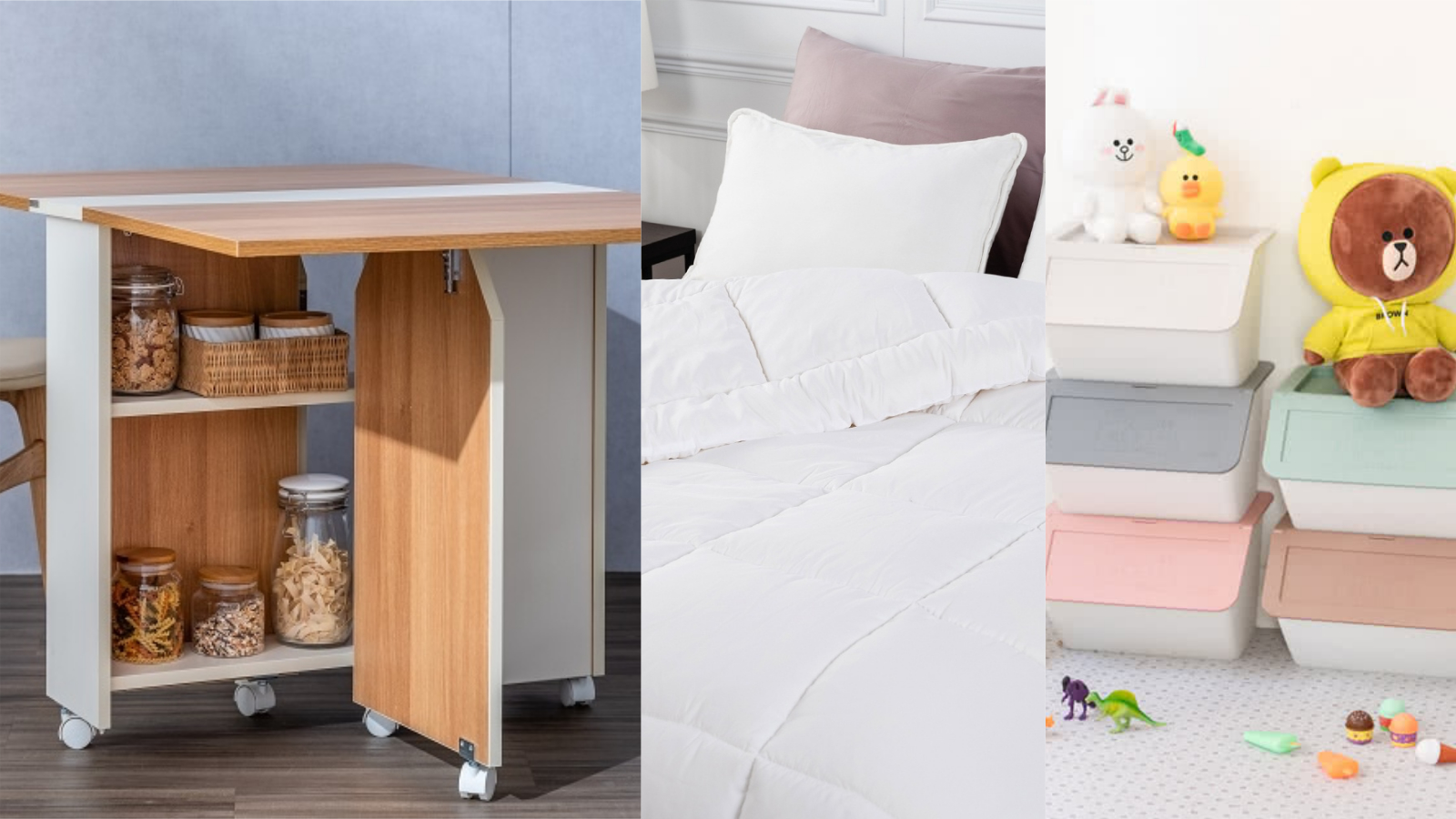特力屋出了很多不同大小、材質、樣式的收納箱,這些收納箱皆可相互堆疊,幫助省下超多空間,時不時特力屋也會與一些卡通人物聯名,像是小熊維尼、LINE FRIENDS的收納櫃就擄獲超多人的少女心!