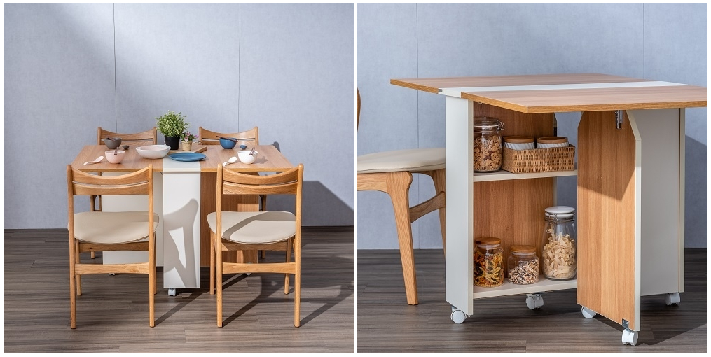 實現了品牌收納學的理念,這款餐桌的機能性非常優秀!不管是單身、新婚亦或是小家庭皆能適應,透過可折疊的桌板能夠自由調整桌子大小,方向輪的設計也讓桌子更方便在家中移動,即使是女生或是力氣小的長輩也能輕鬆移動、調整桌子!