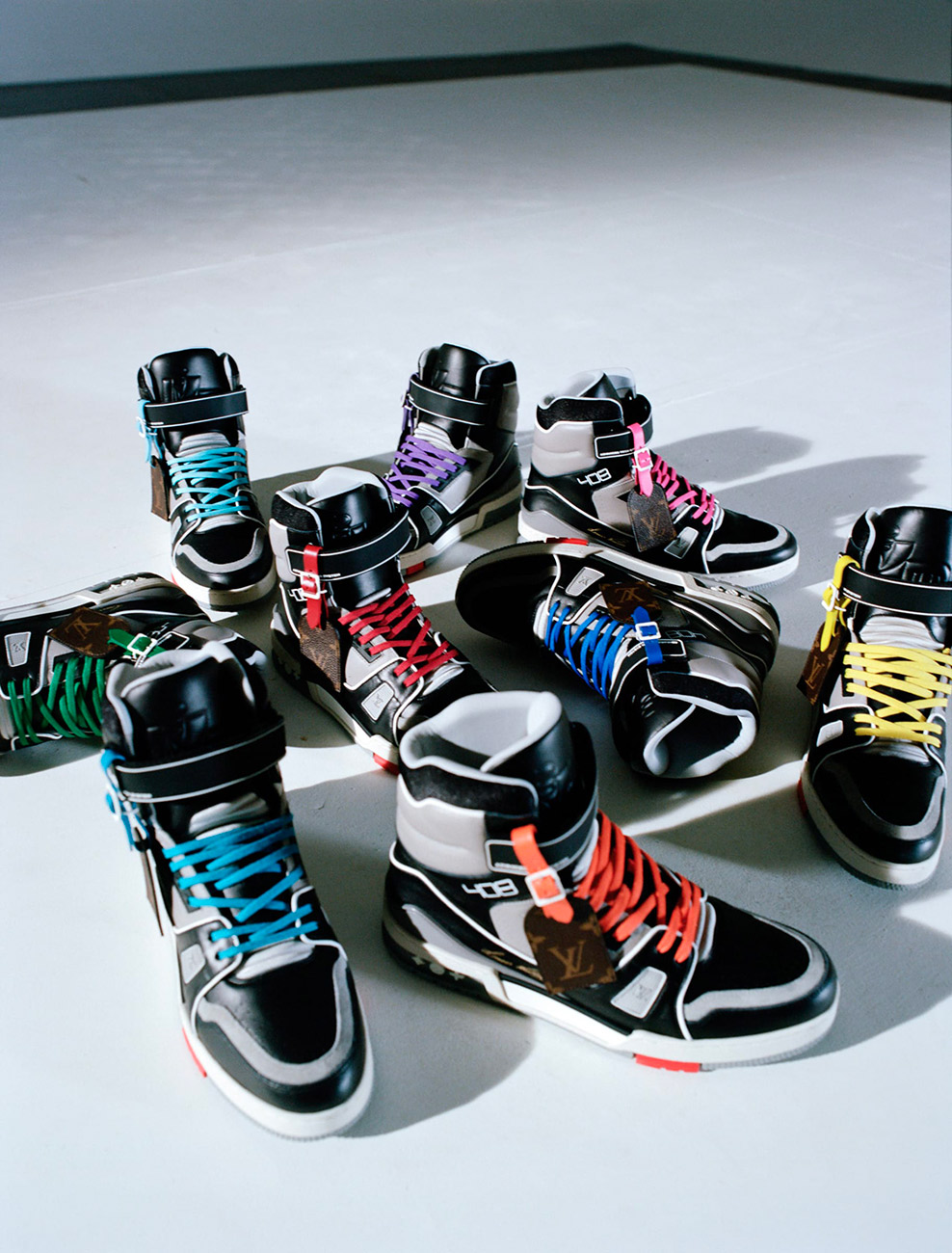 這次 Virgil Abloh 以幫 Louis Vuitton 設,大底有 20 個組件做成,鞋面則有106 個組件。的第一雙運動鞋 Trainers 為基礎。灰色拼接藍色,從鞋帶與掛著 monogram 吊牌的顏色來區分不同的城市,每雙皆是義大利工匠花費 6 個小時打造而成。Virlgil Abloh 的故鄉芝加哥是橘色,紐約是亮藍色,米蘭是鮮艷的粉紅色,巴黎則是 Baby Blue,倫敦是黃色,杜拜是墨綠色,上海的土耳其藍,首爾是紅色,東京則是深藍色。鞋舌有手寫的 LVM字樣,側邊的 408 則是 Virgil Abloh 的生日-8月4日。首爾、紐約已經發售,其他城市將於12/4發售。