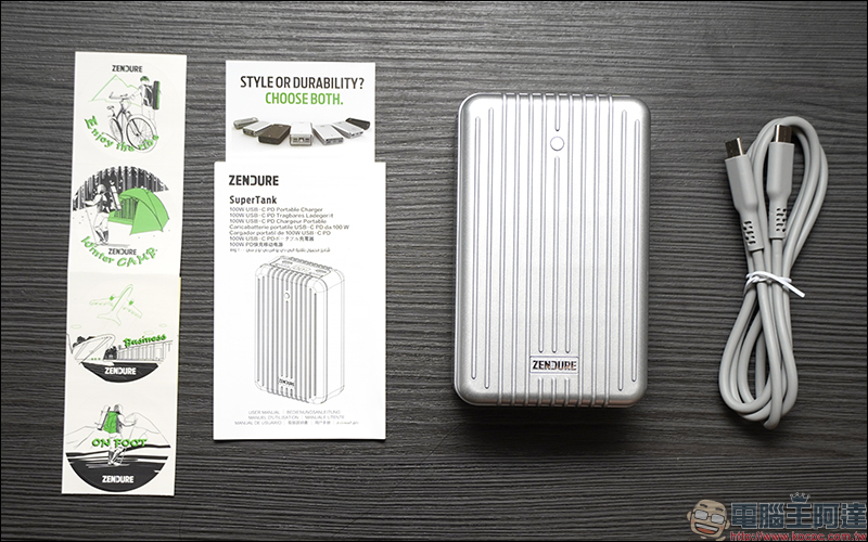 內容物方面,除了 Zendure SuperTank 行動電源,也附贈一條 100W 輸出的 USB-C 充電線和說明文件及貼紙:
