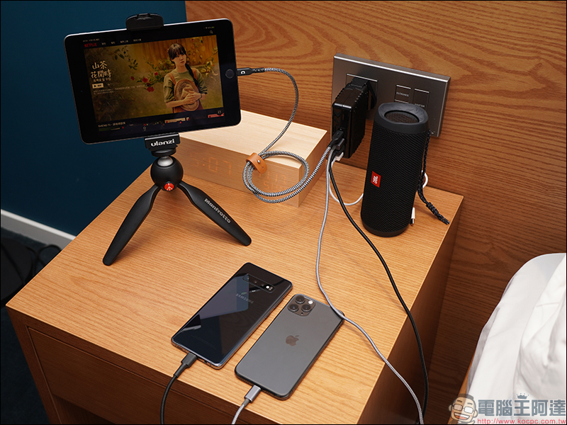 這款 Zendure 萬國充電器採用壁插式設計,因此在飯店房間內相當適合放在床頭的插座上使用。人在國外,睡前想用 iPad mini 追劇,使用這萬國充電器不但只需要一個插座,就能同時為兩支手機、一台平板、藍牙喇叭同時進行充電,不怕因為佔用太多插座和同行旅伴吵架囉!