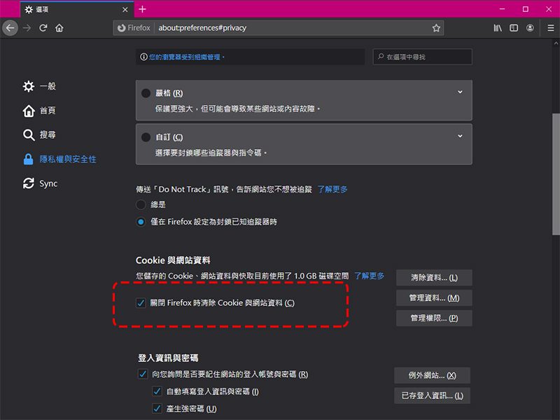 與 Chrome 不同,Firefox 在瀏覽數據的選項方面相對較少,在這種情況下,你只能選擇在關閉瀏覽器時進行移除 Cookie 和瀏覽記錄,但你還是可以選擇手動刪除內容,這算不幸中的大幸。如果你想要設定在瀏覽器關閉時移除記錄,請你在「選項」中的「隱私權與安全性」這一項,將「關閉 Firefox 時清除 Cookie 與網站資料」這一項勾起來即可。