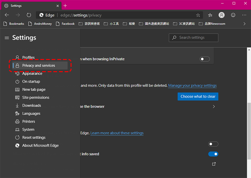 由於它採用 Chromium 為核心,就像 Google Chrome 一樣,因此在 Microsoft Edge 中設定的步驟非常相似,也只有 Microsoft Edge 才能提供更多選擇,讓你在關閉瀏覽器時幾乎刪除所有內容。首先進入「Settings」功能頁面中,點選左上角的折疊式選單跳轉到「Privacy and services」,然後選擇「Clear browsing data on close」這一項,接下來你可以直接選擇你想要移除的項目,只需將後面的開關打開即可。