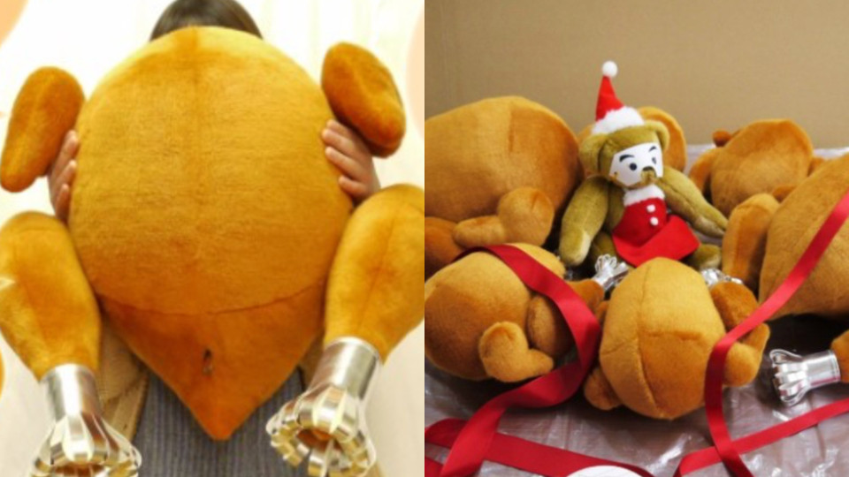 而且烤雞抱枕除了外觀厲害,連「結構」都有顧到!烤雞的身體跟烤雞腿中間是有魔鬼氈設計,所以就像真的在吃烤雞一樣,可以把雞腿扯下來~