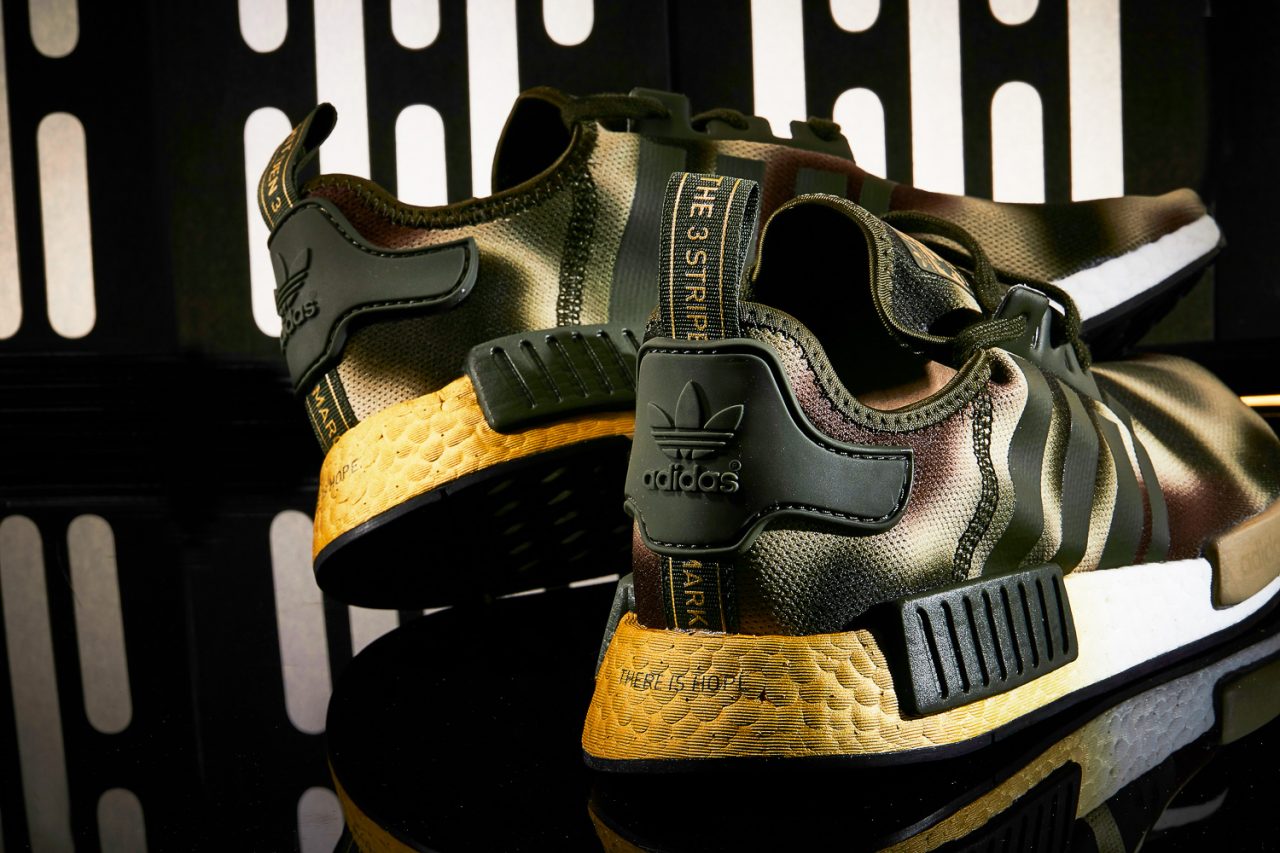 最後我們來到 Star Wars x adidas Originals 也是系列的最終第三部曲,很感動的看到不同時期的經典人物出現在鞋舌,R2-D2 與風暴兵以 adidas NITE JOGGER 具有反光材質設定還原他們表面光澤與金屬,黑武士、尤達還有《星際大戰六部曲:絕地大反攻》恩多戰役裡的迷彩裝莉亞公主則是畫入 adidas NMD_R1,後傳三部曲的主角芮也首次成為鞋款靈感,這些以 adidas NMD_R1 為鞋型的主角們在 BOOST 中底都有著漸層效果共通點,可能是光劍邊緣光,也可以是爆能槍的線性光束,至於鞋舌上印有每位角色的臉部圖像,讓編輯想起過去 Star Wars x adidas Originals 合作也都有此相同設定,勾起過往回憶的還不只這些,後跟寫上的台詞彷彿自帶音效畫面,讓原力陪我們行走每一步,May the Force be with you 。