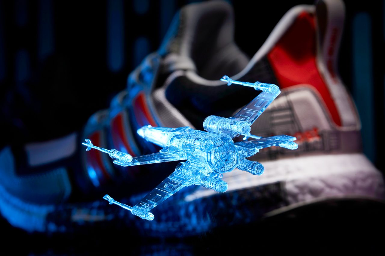 adidas Running 刻意都是以太空載具為設計對象,包含破壞力足以摧毀一顆星球的死星,不論是高科技武器設定或是鏤空結構都與 adidas ALPHAEDGE 4D 技術相像;以銀河系最快走私飛船著稱的千年鷹號對應到中底 BOOST 加量 20% 的 adidas Ultraboost 19,強大回饋能量讓駕駛員即刻進入超光速飛行,而且 adidas Ultraboost 19 故障率絕對不會像千年鷹號這麼高(笑);第三台載具則是以路克·天行者駕駛的 X-Wing 為雛型,關於後跟織帶上台詞可以看我們先前的站內報導,adidas Ultraboost S&L 有著麂皮和皮革加強支撐性,打造更靈活駕馭體驗,我們也可以把這項不同看做 X-Wing 增強了太空戰鬥中更多操縱性的特殊結構。