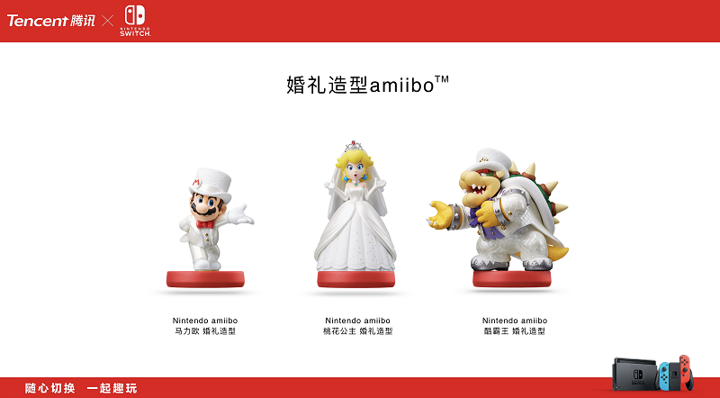 周邊部分,同樣有多種配色 Joy-Con、Joy-Con 充電握把、Joy-Con 方向盤、Joy-Con 腕帶,Nintendo Switch 專業控制器、Nintendo Switch 基座套裝、Nintendo Switch 充電支架、Nintendo Switch 便攜包等官方配件, 及支援《瑪利歐賽車 8 豪華版》和《超級瑪利歐 奧德賽》的amiibo 婚禮造型系列遊戲互動模型。