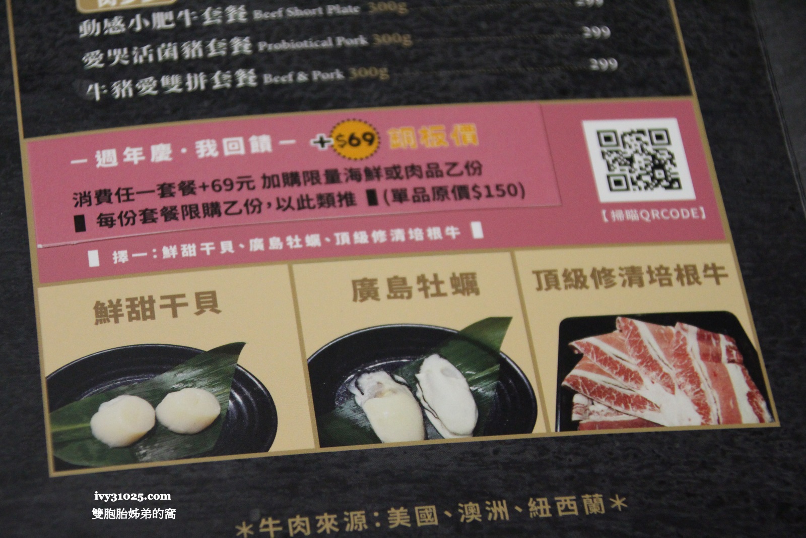 只要你有點套餐+69元就可以點鮮甜干貝或廣島牡蠣或頂級修清培根牛任選一種,就是一個套餐只能加購一種