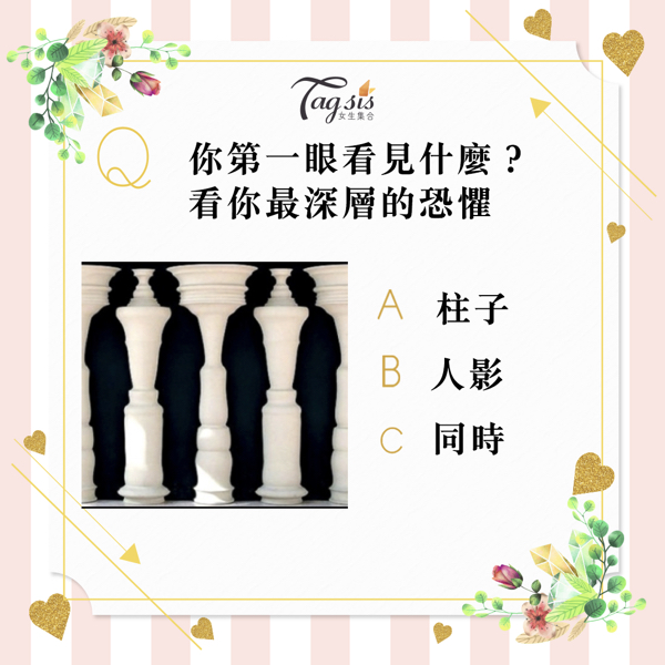 A. 柱子⋯⋯選擇柱子的SIS,如果你第一眼看見的是柱子,代表你有一顆善良的心,對待身邊的人很仁慈。你害怕你付出的不被珍惜,因為你總是無怨無悔地在給予,但有時落到讓人覺得理所當然,所以你心裡最大的恐懼在於「失去」。