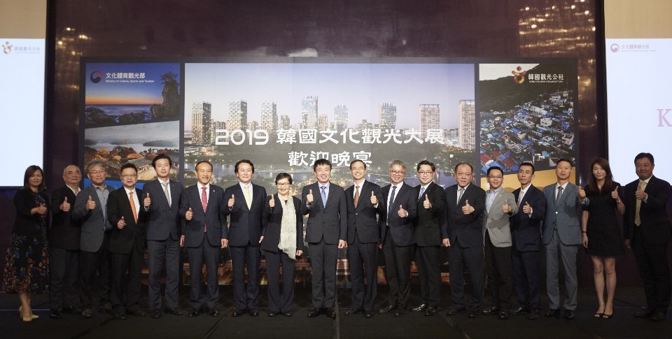 韓國觀光公社社長安榮培(左6)率領男星蘇志燮(右6)、韓國航空公司及企業代表,與交通部觀光局局長周永暉(左5)、台灣觀光協會會長葉菊蘭(右5)一起為2019 韓國文化觀光大展進行開幕。(圖/韓國觀光公社)