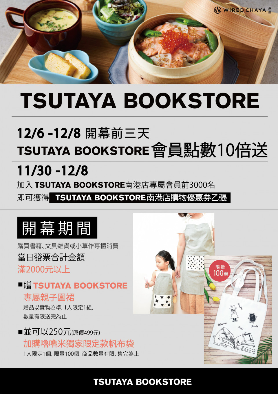 只要在開幕期間於TSUTAYA BOOKSTORE南港店書店購買書籍、文具雜貨等等消費,當日發票合計金額滿2000元以上,即贈送TSUTAYA BOOKSTORE專屬親子圍裙(贈品以實物為準,1人限定1組,數量有限送完為止。)此外,前100名消費滿2000元以上的顧客即可以250元(原價499元)加購嚕嚕米獨家限定款帆布袋(限量100個,1人限定1個,數量有限售完為止)