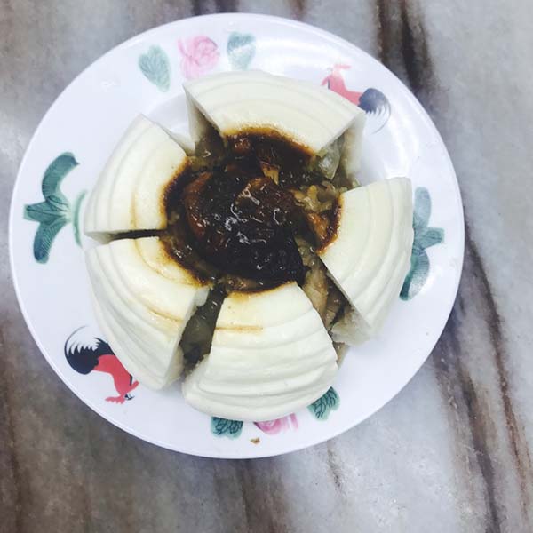老闆首創的雞窩包外表看似傳統大包,裡頭卻是用類似糯米雞的餡料做成,有雞肉、冬菇、糯米、冬粉、鹹蛋黃、叉燒,味道甜甜鹹鹹很順口,適合兩人一起享用,再把胃的空間留給蝦餃或是炒蘿蔔糕喔!