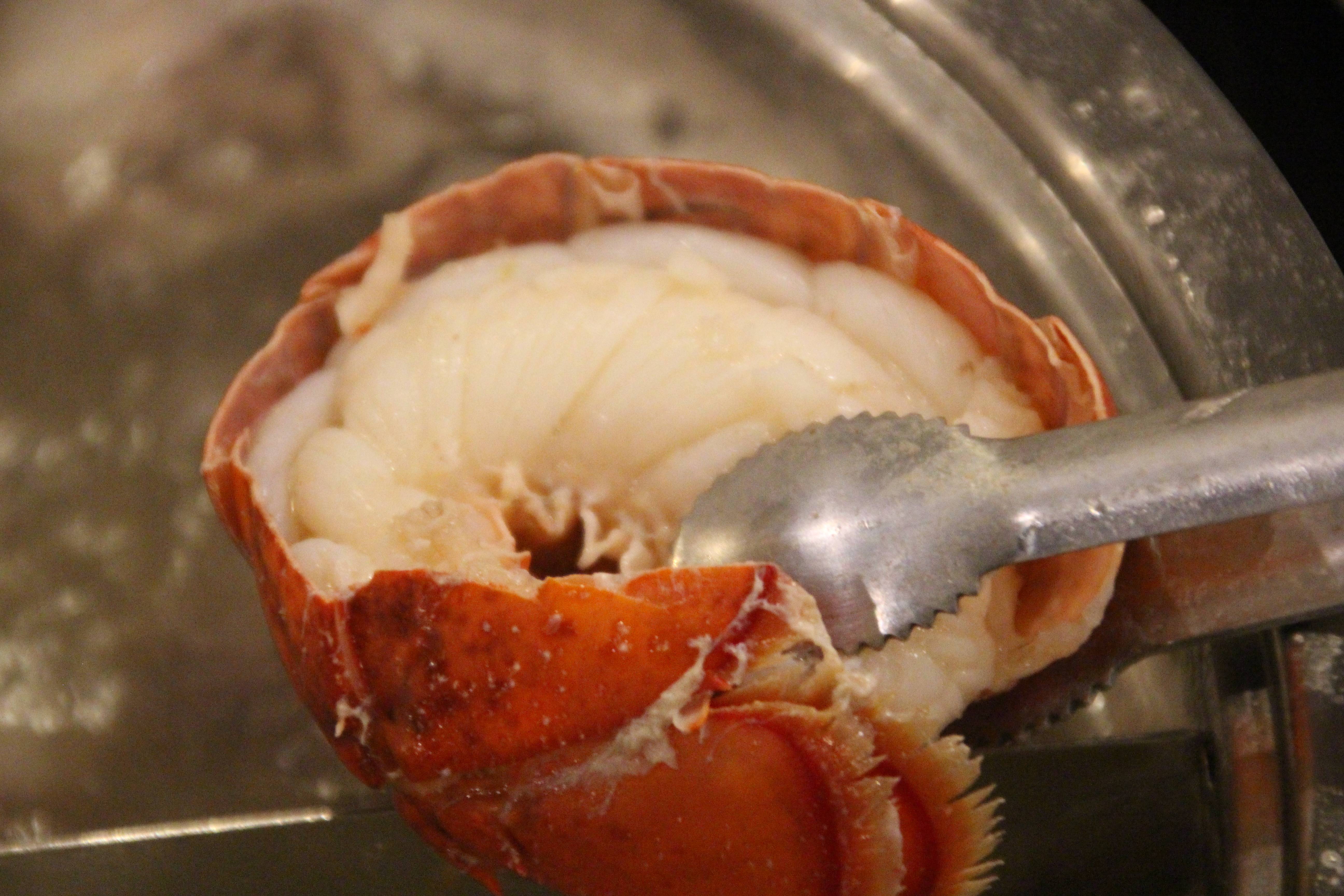 這是波士頓龍蝦煮熟的肉質,要怎麻看蝦子有沒有煮熟?? 看他的身體有沒有彎曲就知道了,有彎曲的話就表示煮熟了可以吃,吃一口龍蝦肉,挖~~好嫩,好多肉汁溢出來,所以舞古賀的龍蝦都是在一進門讓你看得到的活跳跳龍蝦,超新鮮的海鮮。
