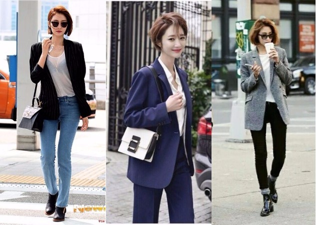 短髮的好處之一就是穿上西裝外套時,更有瀟灑帥氣的感覺!不管是黑色條紋西外搭配T-shirt和牛仔褲(左),整套的藍色西裝搭配襯衫(中)及今年最流行的格紋西外(右)短髮穿起來就是有種長髮缺少的帥氣感。
