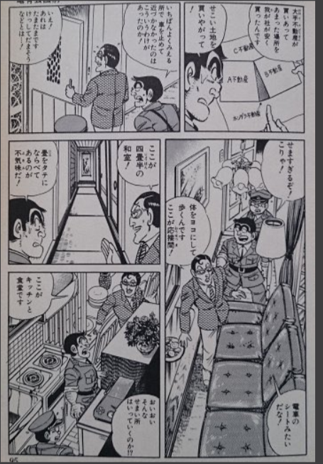 寸土寸金的地方就是會出現許多怪奇的房款,像這個設計圖還以為是在介紹火車車廂的房屋,外型十分「纖瘦」,進去裡面一付張開手臂就能碰到左右面牆的樣子。你以為這是現代都市傳說嗎?其實早在秋本治出版《烏龍派出所》就有這樣的內容。