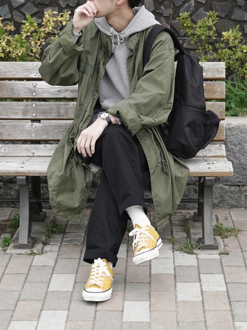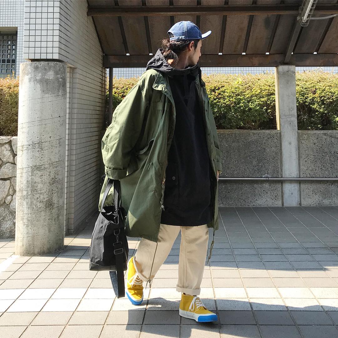 多數台灣男士依舊偏好休閒舒適的穿搭,這時就相當適合利用百搭的 Hoodie 來與 M65 Parka 穿搭,將帽子往外置於 Parka 領外營造細節層次,是相當適合氣溫落於 15-20 度時著用的最佳組合範本。