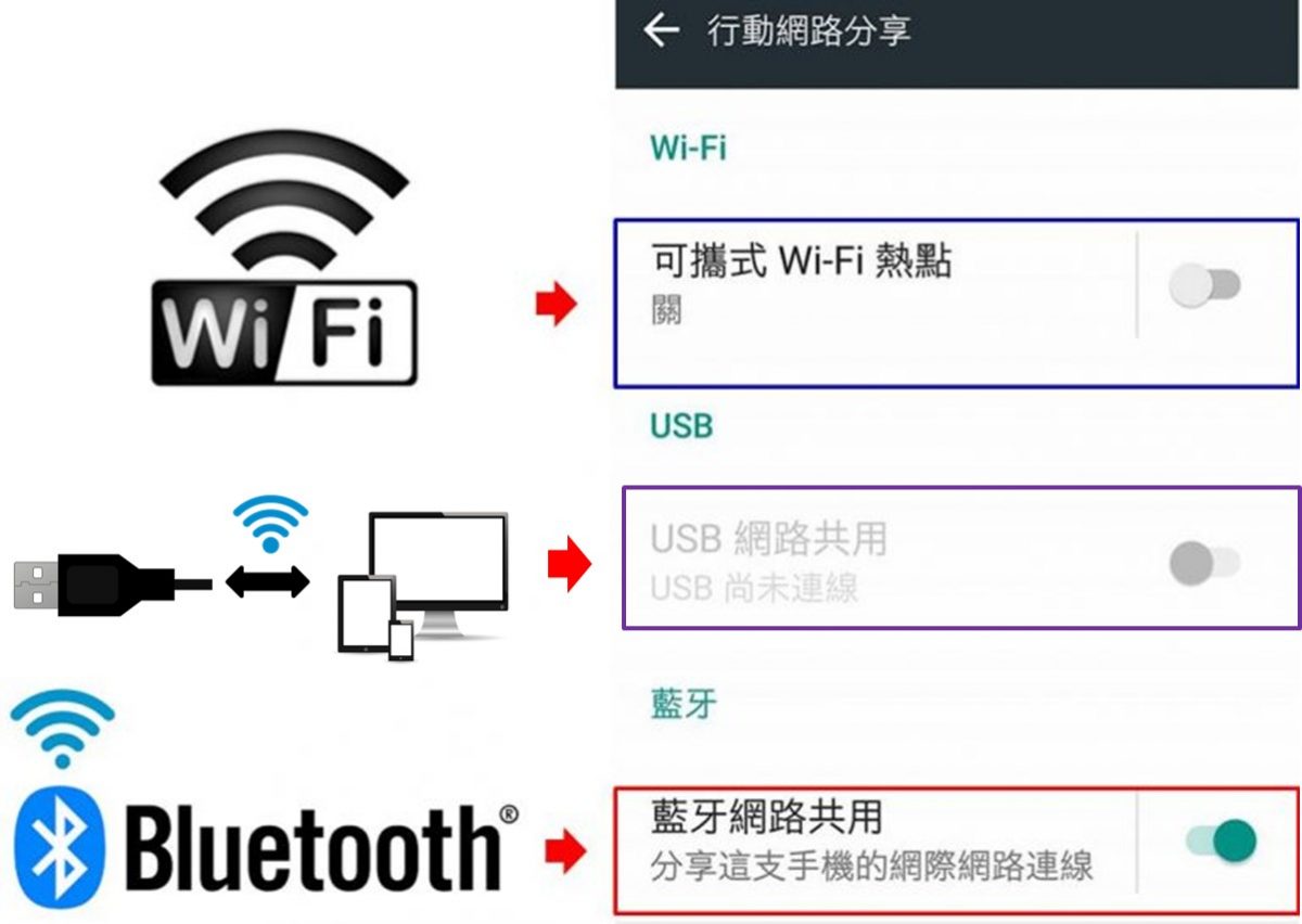 手機當作WiFi熱點分享、藍牙網路共用、USB網路共用有什麼差別呢? 以下作一說明: