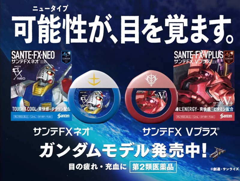 過去曾與《進擊的巨人》、《航海王 ONE PIECE》聯名過,參天製藥推出的人氣眼藥水「Sante FX」系列,最新動漫聯名產品是與《 機動戰士鋼彈 》合作,推出鋼彈與夏亞薩克版本的特別樣式。