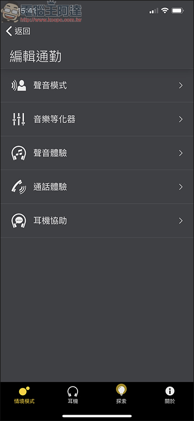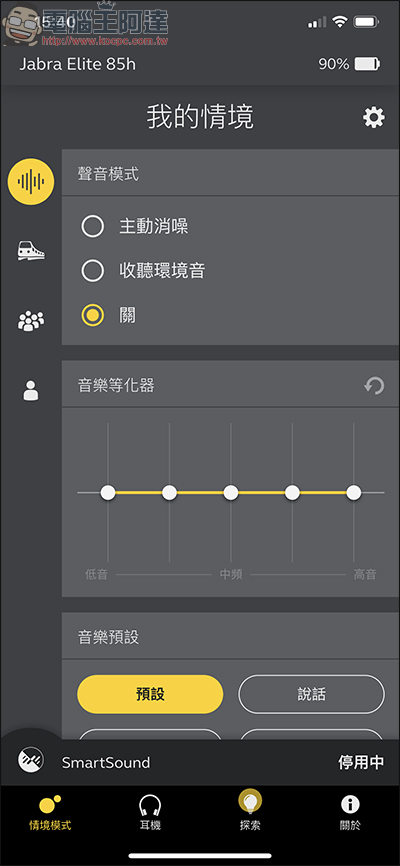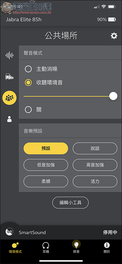 情境模式的部分,預設已有四種模式,分別是我的情境、通勤、公共場所、私人場所,可以自行調整聲音模式,或是透過音樂等化器調整喜好的低音、中頻、高音 :