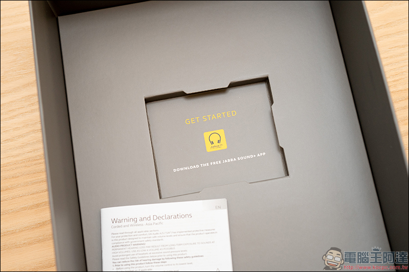 盒子內部沒有使用說明書,只有一份警告聲明&保固說明的小冊子,使用說明的部分交由App負責,所以才一再地提醒要下載Jabra的APP。這點相當不錯,畢竟說明書看完之後,就沒什麼用了,還可以減少資源的浪費 :