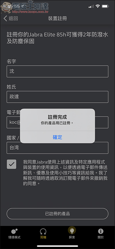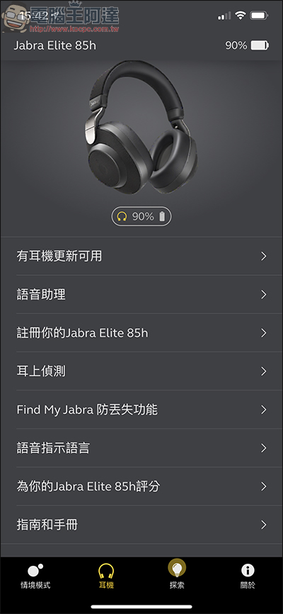 在耳機設定介面裡,可使用很多功能,例如很酷的一點是,Jabra Elite 85H有提供更新服務,只要透過App連接耳機就能更新了 ,要記得註冊才有2年防潑水防塵保固 :