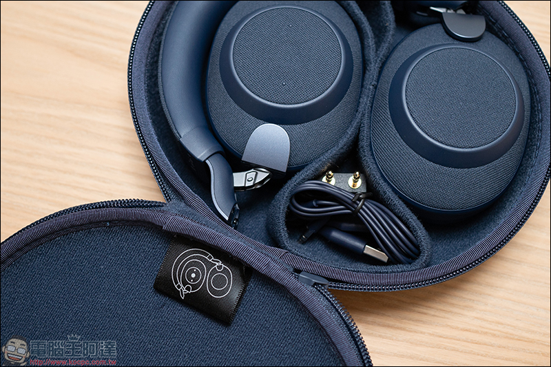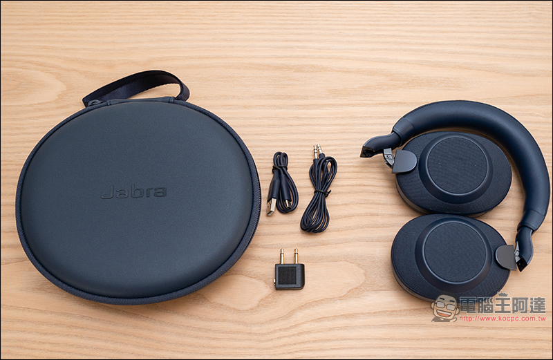 Jabra Elite 85H內有 : 攜行箱*1、Jabra Elite 85H耳機本體*1、Type-c充電線*1、3.5mm耳機線*1、飛機用的耳機音源轉接頭*1,除了轉接頭以外,耳機加上配件都採用海軍藍一致性的顏色 :