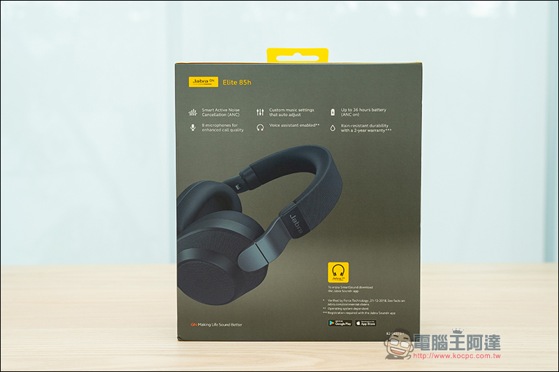 背面跟正面差不多,標示了Jabra Elite 85H的六點特色 : 主動式ANC 降噪、自訂義的EQ設定、長達36小時續航、8組麥克風、語音助手及2年防水防塵保固,並在右下角提醒可以下載Jabra的App做搭配使用 :