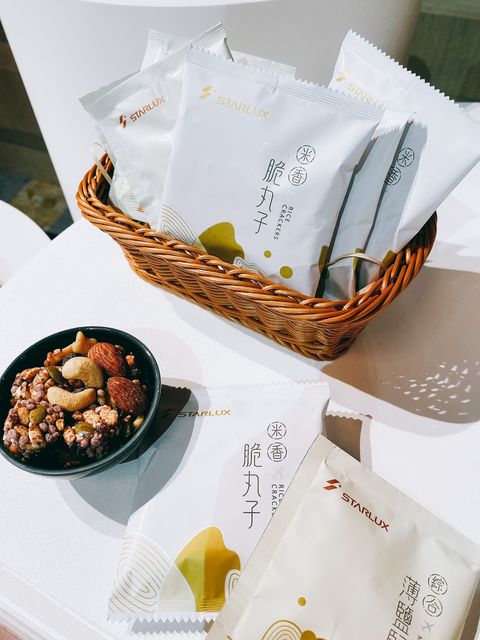 搭配飲品的點心也不馬虎!全機提供由專業營養師調製之米果點心,使用安心契作糙米及紫米,搭配未抽取果汁之優質蔓越莓乾,並添加南瓜子增添口感,全素食且無麩質配方,以不油炸,無添加的烘焙方式,製作美味的米香脆丸餅,是一款美味與營養兼具的機上點心。商務艙還提供堅果點心,選以杏仁粒、核桃、腰果、蔓越莓乾,並加入海鹽調製增添風味。