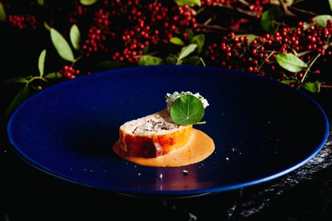 有著傳統法式料理底子的主廚端出在夏威夷餐廳每逢聖誕節必端出的料理。風味鮮甜的胭脂蝦派包覆著香嫩的小牛胸線,搭配著慢火熬煮而成的南迪雅蝦醬,用色澤為這道料理增添節慶氣息。