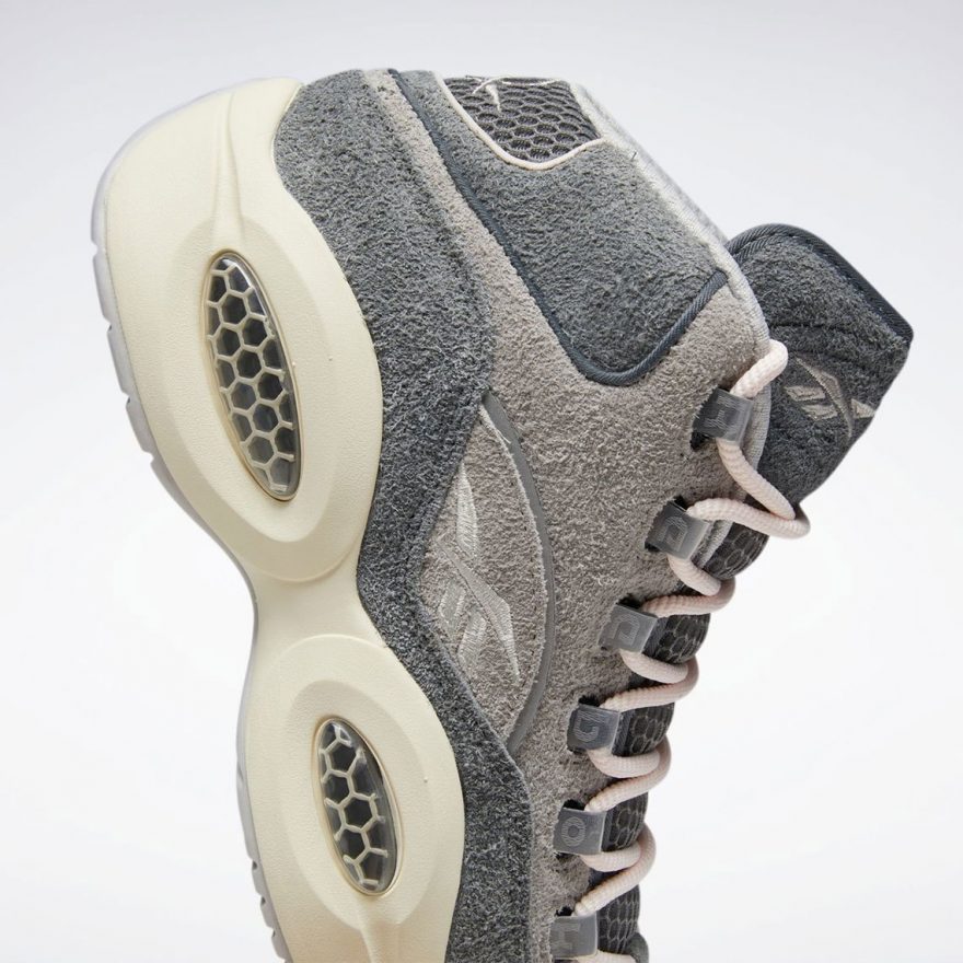 是的沒有看錯,過去 Question Mid 是以皮革鞋面為主,而今 Reebok 推出了翻毛皮版本。這雙 Question Mid 整體選用灰色,另外搭配了粉紅色的鞋帶,有趣的是,在鞋舌、鞋後跟上可以看到網布材質,這樣的設計倒有點像 Reebok 招牌的 Hexalite 緩震系統,巧妙的設計不知是否有在向 Hexalite 致敬呢?