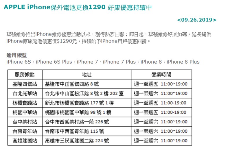 目前台灣已有不少業者取得Apple維修授權,也不定期推出電池更換優惠促銷。除燦坤推出的限時促銷外,目前聯強維修中心iPhone 6S、iPhone 6S Plus、iPhone 7、iPhone 7 Plus、iPhone 8、iPhone 8 Plus的更換電池價格為$1,290。