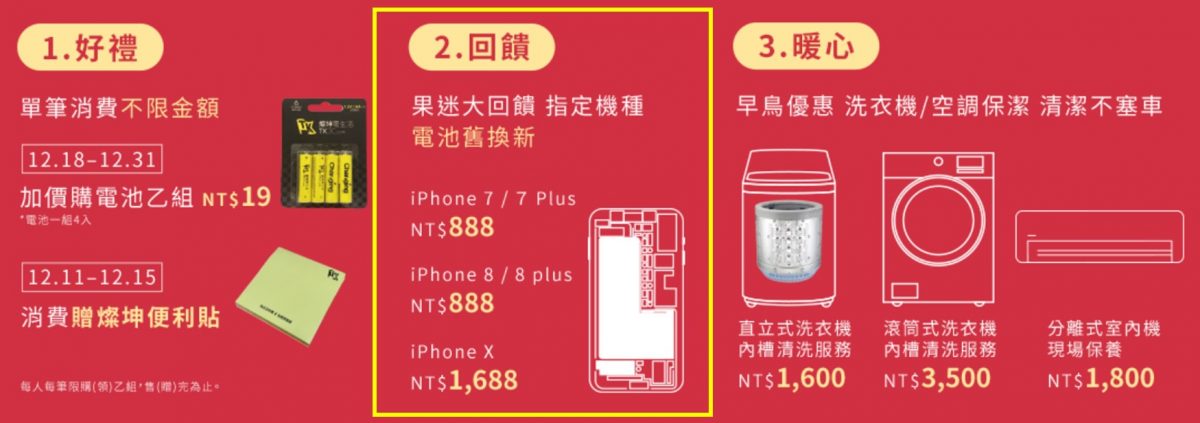 燦坤2019.2.5~2020.1.6推出【暖心年終慶】活動,包含好禮、回饋及暖心三大活動,其中為回饋果迷,活動期間到全省燦坤 AppleShop 門市更換iPhone優惠電池,推出指定機種電池舊換新優惠價$880起。Apple iPhone7/7 plus電池舊換新價NT$888、iPhone8/8 plus電池舊換新價NT$888,iPhoneX電池舊換新價NT$1,688。