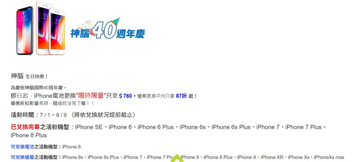 之前,神腦40周年慶曾推出$760優惠,不過該活動已經截止。換言之,日後若舊款iPhone電池老舊需要更換,建議可以先查查Apple授權維修的業者是否有推出優惠活動,可以省點錢!