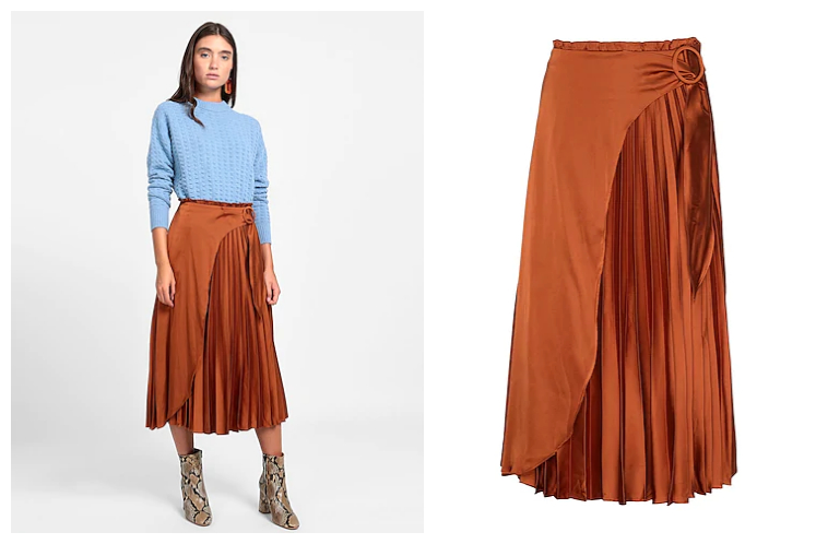 單品的彩度不過高,撞色卻不違和的搭配特別又耐看,像是這件長裙使用的就是當季很流行的光澤面料,百褶裙的紋路搭上優美的垂墜感超仙!