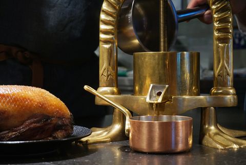 製作榨鴨的醬汁會需要使用到馬德拉酒和白蘭地,將馬德拉酒和白蘭地混和之後,再加入鴨的胸骨壓碎,鴨的精華便會流出。